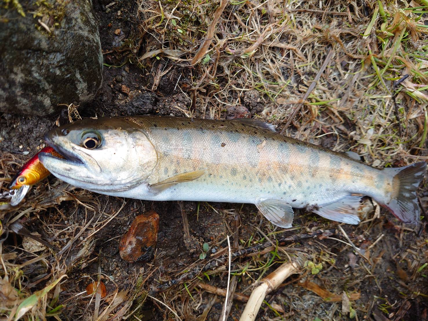 岩魚が出ました!しかも尺越えの岩魚です。春先は大物が出やすいと言いますがその通り出てきました。反転流で流し白泡に入ったら出す!と言う戦法で以前も岩魚を釣ったことがありますのでこの戦法は岩魚に有効のようです。